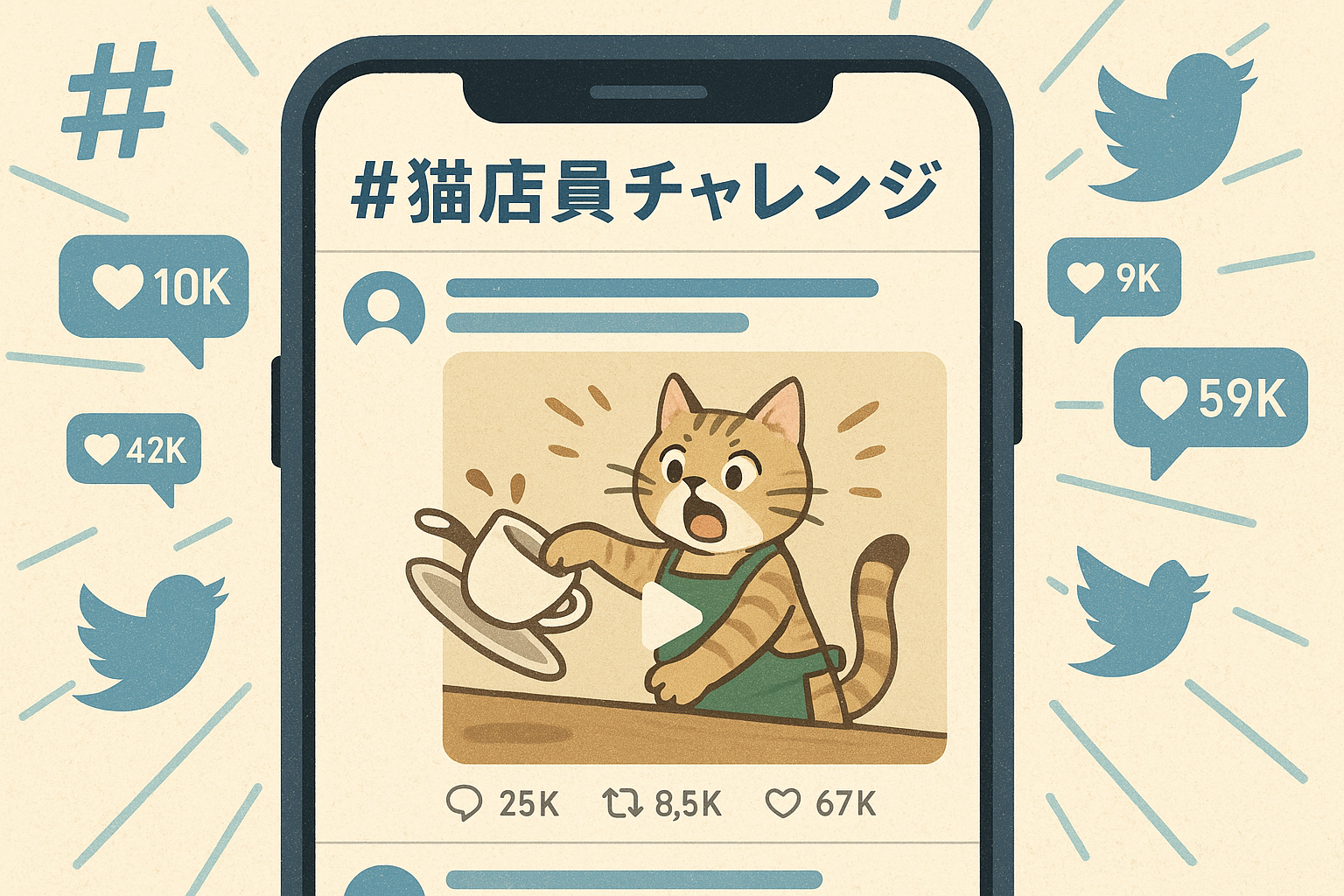 その日の夜、真理がSNSを見ていると、偶然「#猫店員チャレンジ」というタグが急上昇しているのを見つけた。