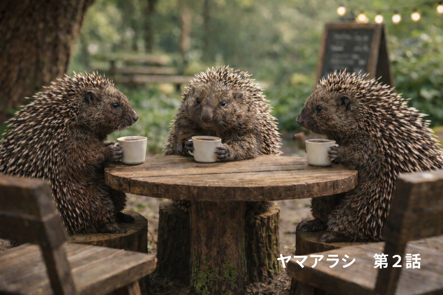 森のカフェで、仲間のヤマアラシたちが集まっておしゃべりをしていた。