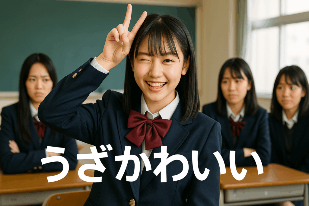 制服のリボンをちょっとだけ斜めに整え、指でピースサインを額に乗せた彼女は、笑顔全開だった。
